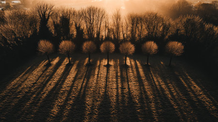 Rising sun illuminates trees surrounded by the morning mist