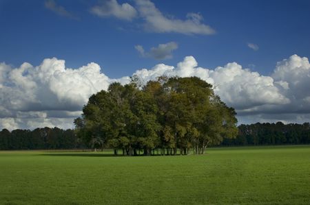 A copse of trees in a green grass field.