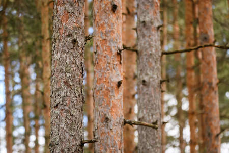 Closeup Trunk of a pine tree in close-up against the background of a green forest. Concept of conservation of nature, forests and the environment.