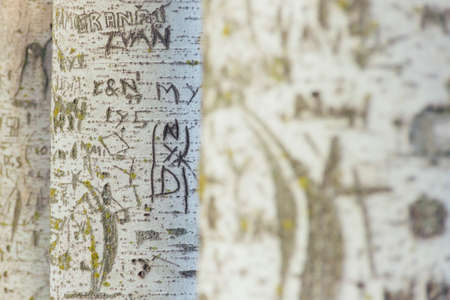 Autumn orange yellow leaves in birch bark close-up. White nature background. Plane of birch trunk surface. Tree textured backdrop. Detailed natural texture of birch tree stem. Abstract background.