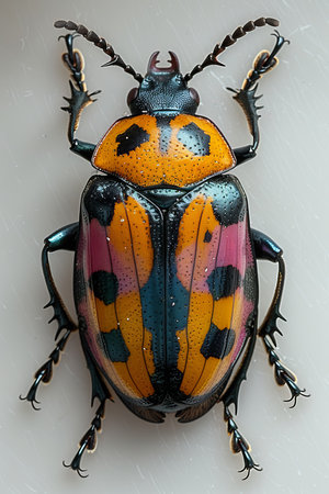 This close-up image showcases a colorful beetle resting on a bright yellow background, revealing its intricate patterns and striking colors.