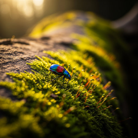 A stunning macro shot of a colorful beetle resting on a mossy log, showcasing intricate details and vibrant colors that highlight nature's beauty.