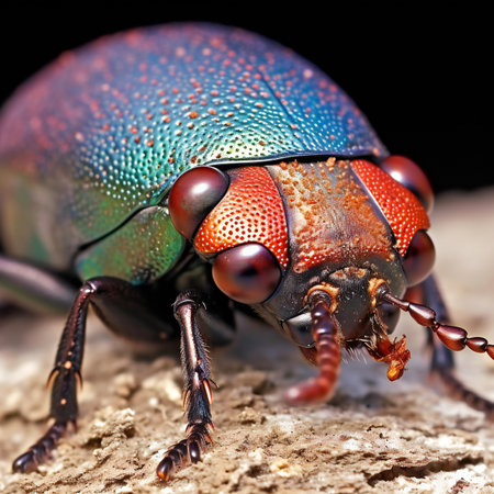 A colorful beetle explores the rough surface of a tree bark, showing its intricate patterns and details, highlighting the beauty of nature in a forest setting.