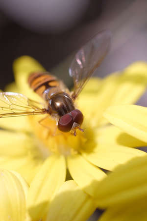 The insect sits on yellow flowers. The wasps feed on pollen. Macro - flying insect
