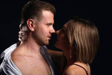 Portrait of a young in love. Attractive girl touches a guy's face with hands.