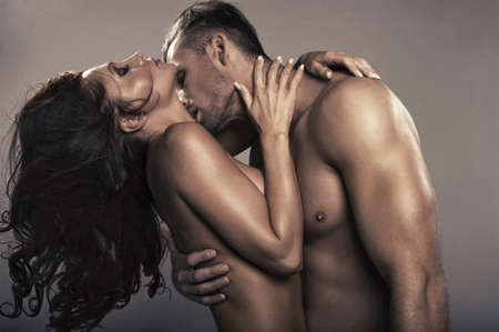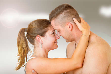 Sexy young couple of undressed. Shirtless man and woman hugging. Studio portrait. Copy space. Young sexy couple. Studio shot of couple in valentines day. Isolated gray background.