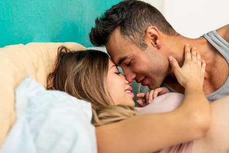Lovely happy couple in love, smile, and kiss each other on their bed in the bedroom