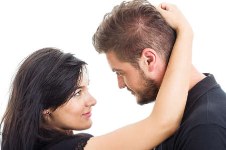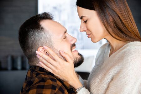 Smiling faces of couple. People look at each other. Missed you so much, darling.