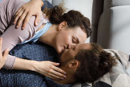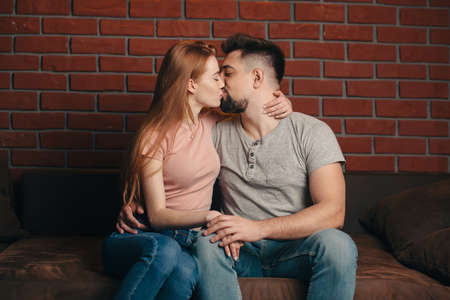 Lifestyle, family and young people concept: lovely couple in love hugging and kissing, sitting on bed