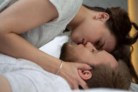 Affectionate young woman kissing man. Sensual and romantic young couple kissing and making love on the bed at home in the morning. Close-up of happy couple is lying in bed together. Enjoying love
