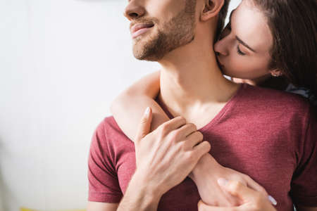 couple in love kissing inside. enamored guy and girl are hugging close-up.