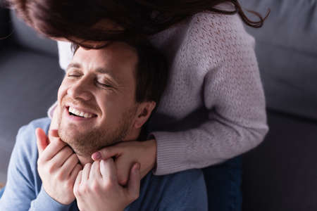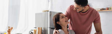 Side view of smiling woman hugging shirtless boyfriend at home, banner