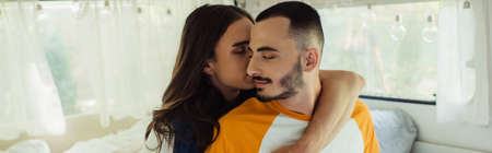 gay man with long hair and closed eyes hugging bearded boyfriend in van, banner
