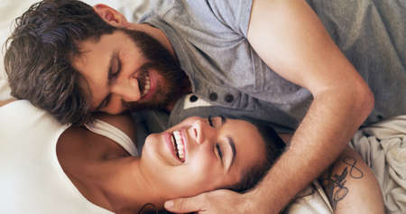 Finding comfort in each other. High angle shot of an affectionate young couple lying in bed together.