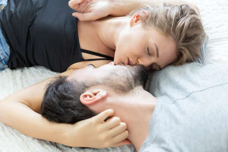 Affectionate loving millennial bonding married family couple newlyweds homeowners kissing, lying on cozy couch, enjoying romantic sweet tender carefree weekend vacation time together at home.