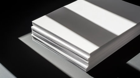 A visually striking arrangement of blank white paper sheets stacked neatly on a dark surface, showcasing the interplay of shadows and light, ideal for creative projects.