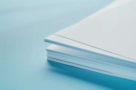 A stack of white paper is on a blue surface. The paper is white and has a smooth texture. The stack is neatly arranged and he is organized. Concept of order and simplicity