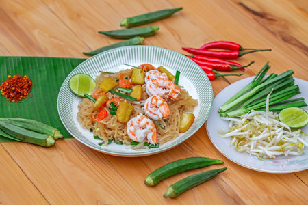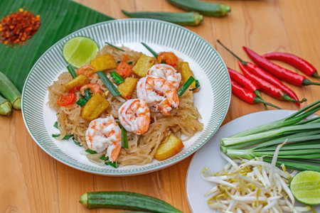 Thai food, Pad Thai with shrimp and vegetables on wooden background