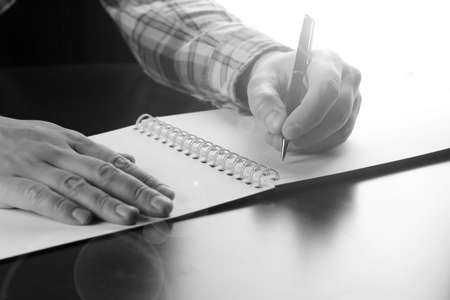 Woman right hand writing on notebook at home area in morning with sun light and vintage tone.