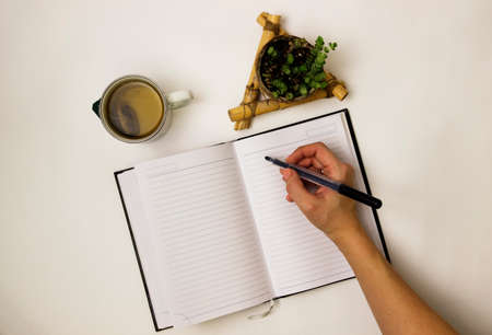 Hand writing plans in notebook or planner over wood cafe table with sunlight from window and coffee cup, close up.