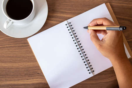 brown skin hand use black pencil writing on white page of small notebook place on wood texture, empty area on left of image for copy space and thinking time concept, from top view