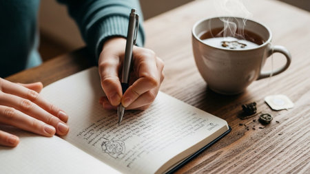 Focused individual jotting down plans and notes in a diary, with a blurred background hinting at a cozy environment