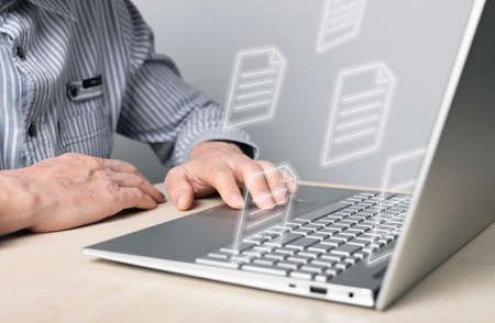 User working on laptop with virtual screen of Document Management System (DMS), a virtual online documentation database. Concept for business and office management. Selective focus