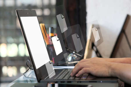 Businessmen use a laptop to transfer, backup, and download documents online. Receive - send, and exchange databases, Data transfer concept.