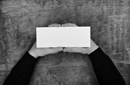 small white piece of paper in his hand man monochrome