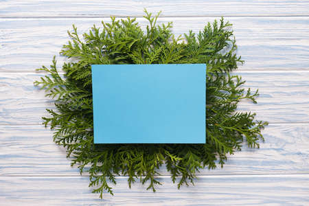 Mockup Christmas greeting card and fir branches on blue wooden background. Template for seasonal greetings. Space for text.