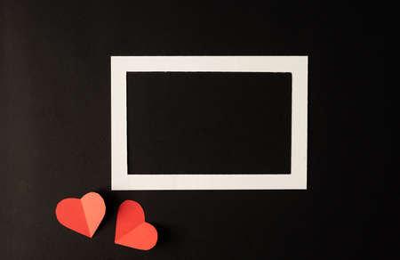 White photo frame and red heart paper pasted on a black background.