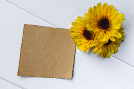 Torn brown paper on wooden surface and sunflower flat lay with copy space. Directly above.