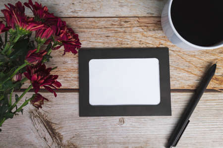 Chalkboard frame on wooden desk with pen, coffee cup and dahlia flower. Directly above, flat lay, copy space.