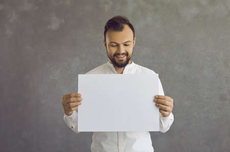 Happy young caucasian man holding blank sheet of paper standing on gray background. Man in a white shirt smiling looking at a blank mockup in his hands. Area for advertising.