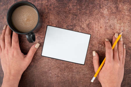 Hands Of Businesswoman With Blank Paper, Coffee Cup And Pencil Over Wooden Background. Woman With Empty Sheet And Drink Writing Important Strategies For Business.