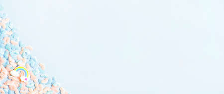 Blurred abstract banner. LGBT rainbow in clouds symbol. Pink Blue hearts on Blue background. Flat lay, top view, copy space. high quality photo