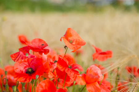 Color contrast: red poppy and yelow wheat, poppies in wheat field under the morning sun.