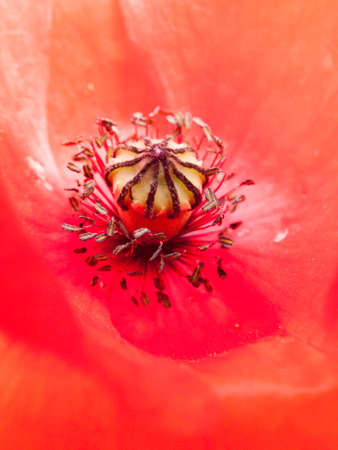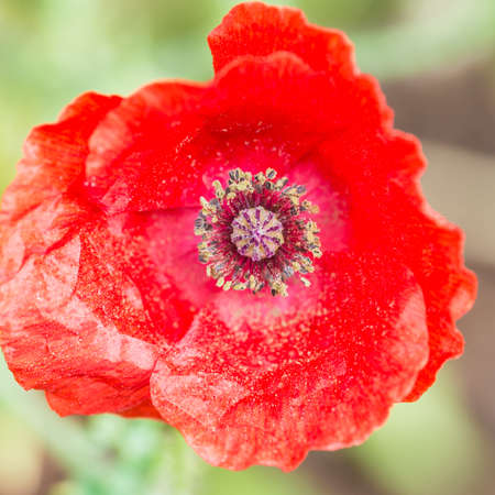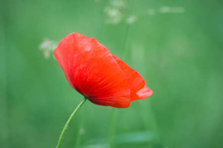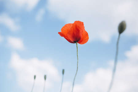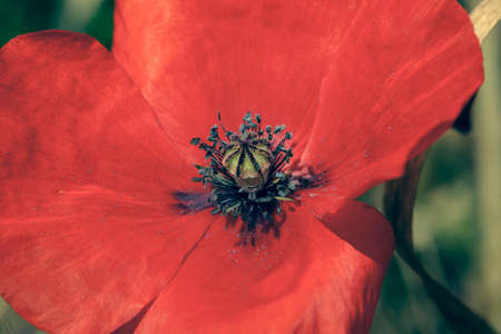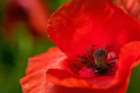 Red poppy flower ( Papaver ) close-up on a blurred natural green background in the sunlight. Flower in the meadow.