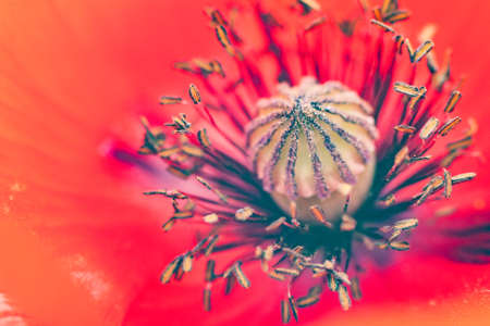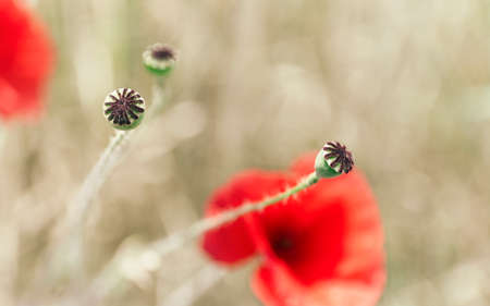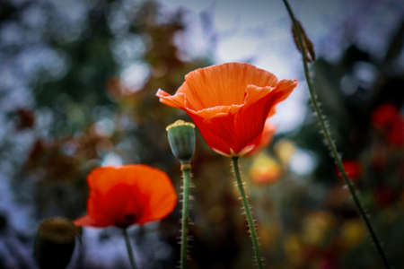 Close up of beautiful, red, blooming poppies in a natural field. Shot with vintage Helios lens 40 2