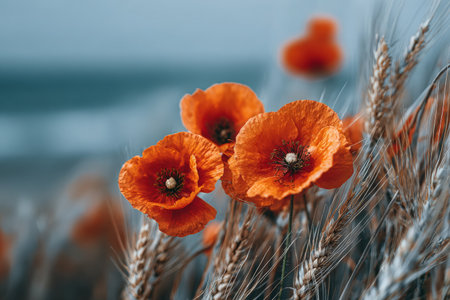 Bright orange poppy flowers stand out among golden wheat, showcasing their delicate petals and intricate details against a serene blurred background of nature