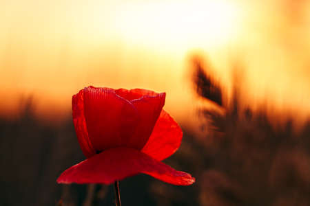 beautiful wild poppies in the field, close up. Rural scenery. Spring farm field landscape. Sunset light.