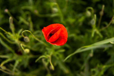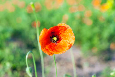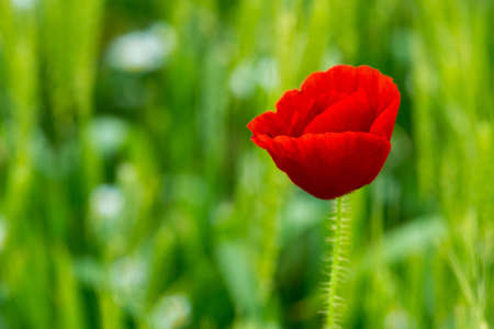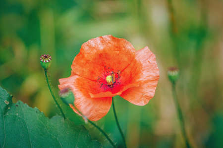 Bright poppy flower. Red poppy flowers blooming in the green grass field, floral natural spring background. Close up poppy head.