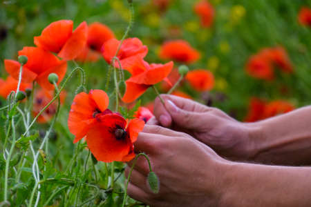 Tearing the poppies for a bouquet. Poppy flowers in the clearing. Blooming red wild poppy. Red poppy flowers.