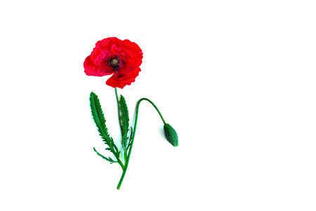 Red poppy isolated on a white background. Creative still life summer, spring concept. Greeting card in flat lay style. Copy space.
