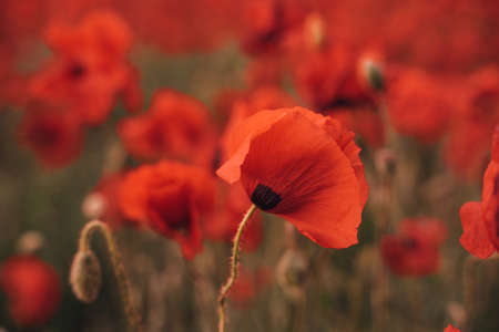 Remembrance day poppy. Red poppies in a poppies field with desaturated background