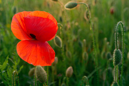 Beautiful flowers red poppies blossom, wild field at sunset, selective focus, soft light, light of setting sun, Close-up of scarlet vivid poppy on green fleecy stems, sunny summer day, Czech Republic