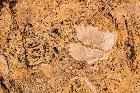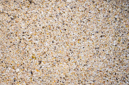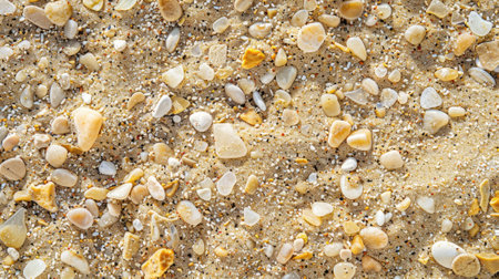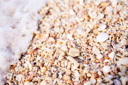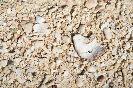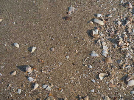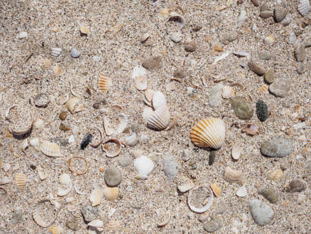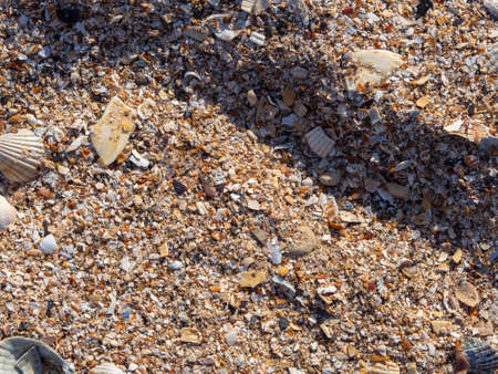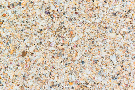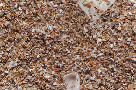 Natural shell-sandy beach background with a pronounced texture close-up. Seashells and sand texture background