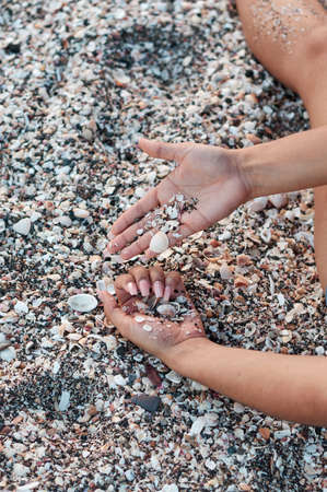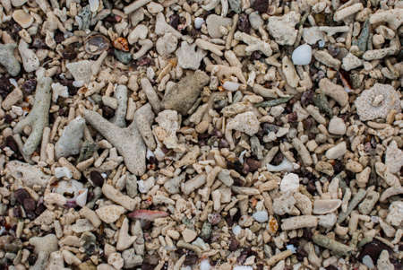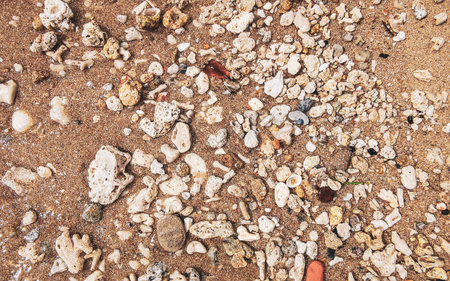 Beach sand with pebbles stones rocks colorful shells mussels corals and turquoise blue clear water texture pattern in Patong Kalim Beach Kathu District Phuket Island Province Southern Thailand.