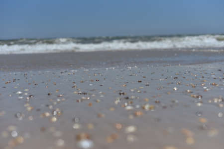 Beach with a lot of seashells on seashore in South Padre Island, Texas