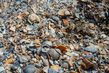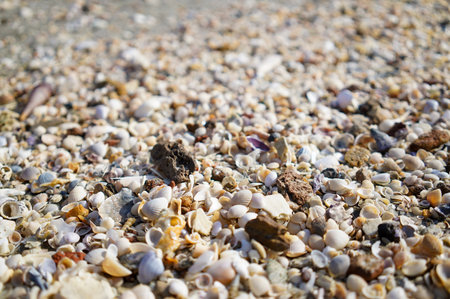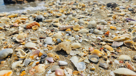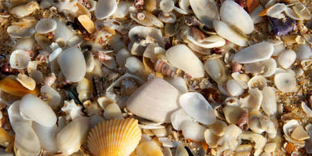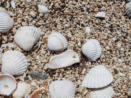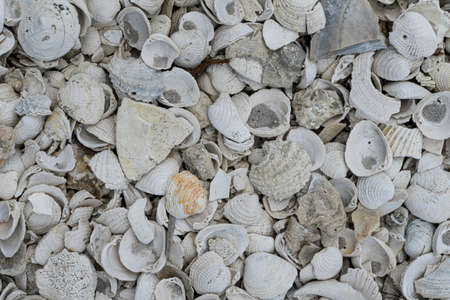 Close up beach with whole and beaten shells at sunrise lights. The mass of shells on the coast of the sea. Texture seashells background. Natural pattern backdrop.